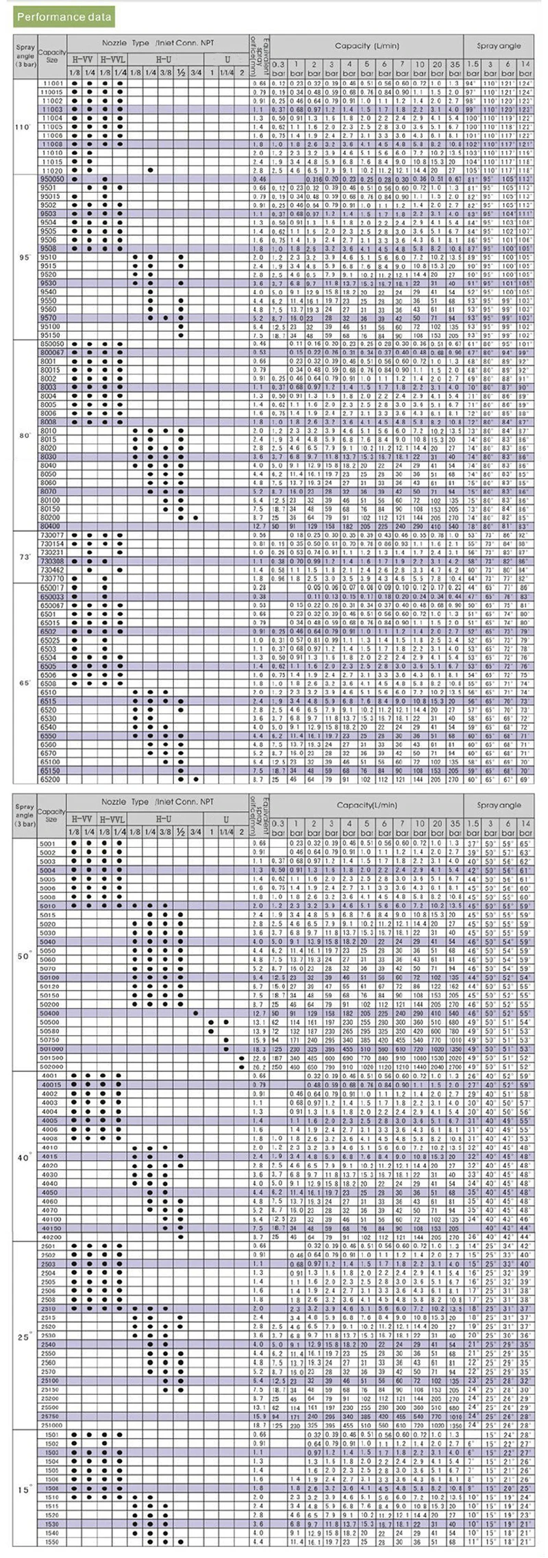 It is available in a wide range of spray angle from 15 to 110 degree measured at 3 bar,the spray angle generally increase with pressure, as shown the performance table.