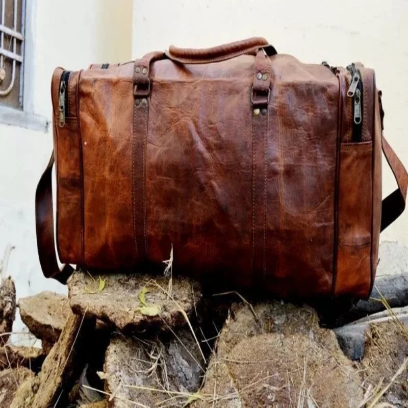 Travel in style with our Premium Handmade Leather Duffle Gym Bag, crafted for durability and elegance.