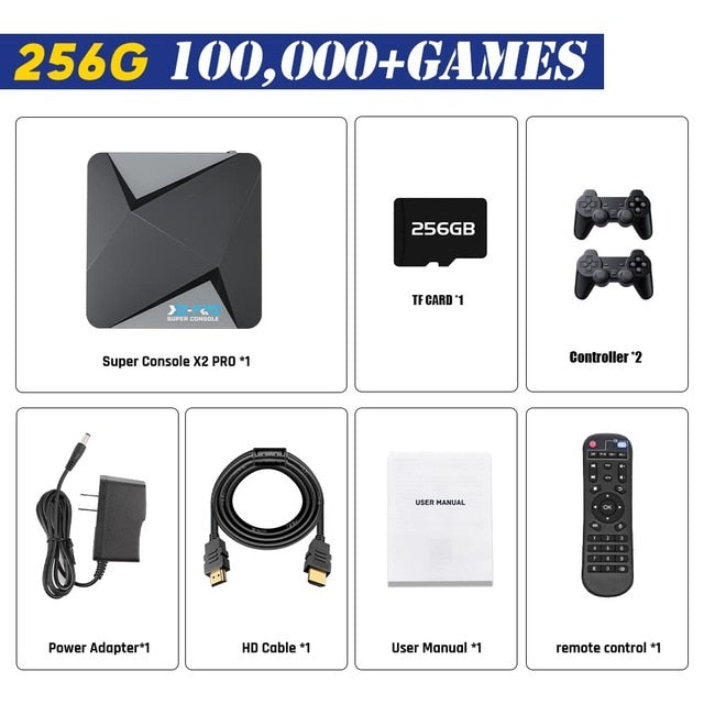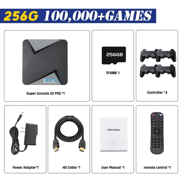 The Super Console X2 Pro pre-loaded 60+ emulators, such as MAME/SNES/N64/PS1/PSP/DC/Sega Saturn and so on. 256GB comes with above 100,000 classic games. Plug & play.