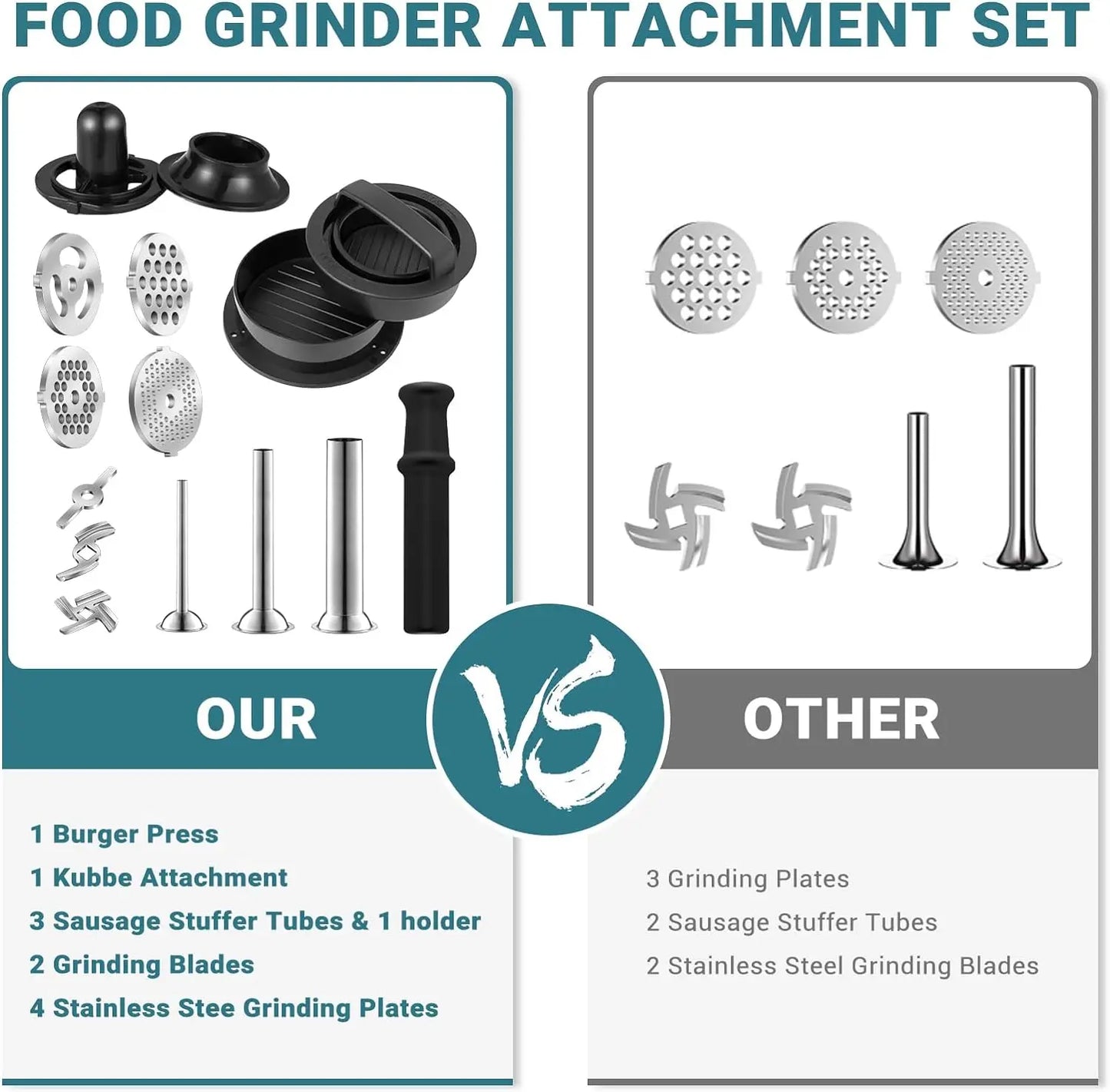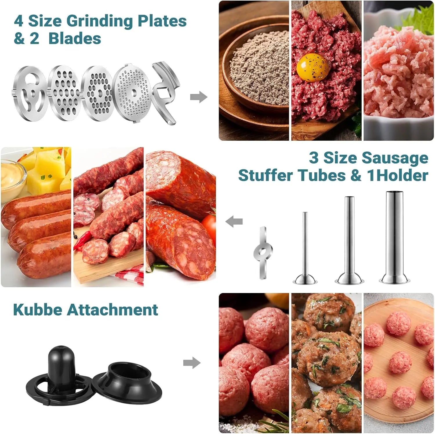 Transform your KitchenAid Stand Mixer into a powerhouse with our premium Meat Grinder Attachment featuring 2 Blades, 4 Plates, and a Sausage Maker Kit.