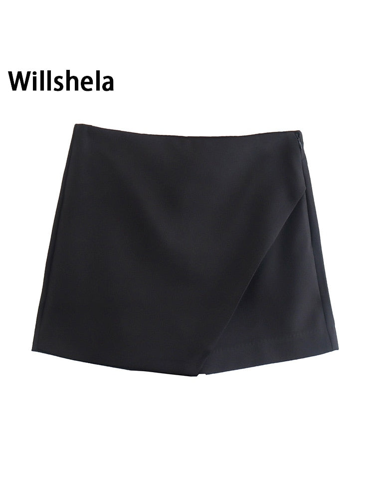 Willshela Women Fashion Asymmetrical Shorts Skirts High Waist Back Pockets Side Zipper Vintage Female Skort Solid